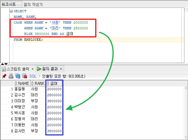 CASE WHEN RANK = '사원' [조건식1] THEN 2000000 [조건식1 만족시 출력데이터] WHEN RANK = '대리' [조건식2] THEN 2500000 [조건식2 만족시 출력데이터] ELSE 3500000[조건에 만족하지 않을 때 출력데이터] END AS 급여[컬럼명]