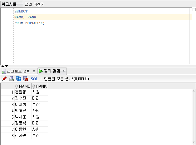 상단의 화면에는 사용자(NAME)와 직위(RANK)라는 컬럼이 존재합니다.