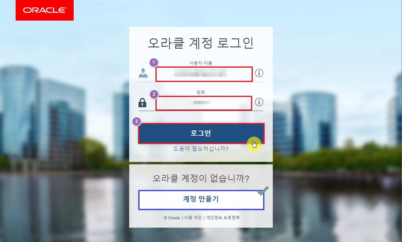 오라클 계정이 있다면 계정과 암호를 입력 후 바로 로그인을 하시면되며,