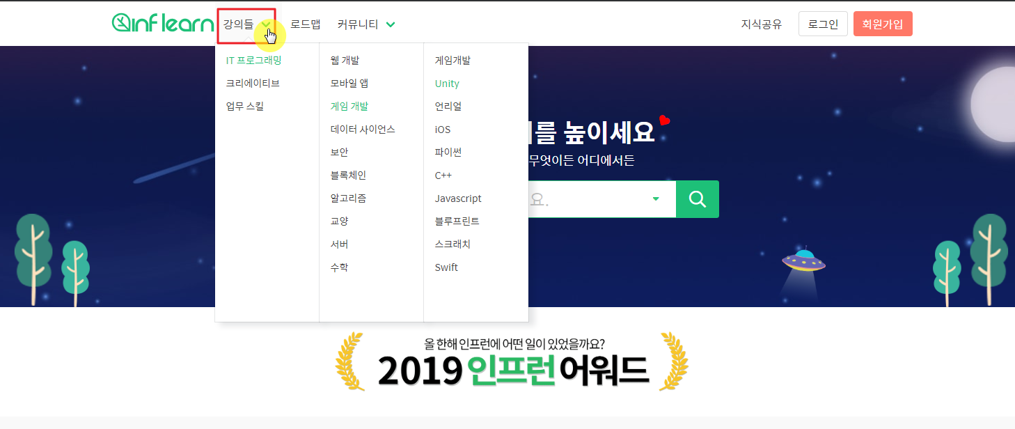 좌측 상단의 [강의들] 이라는 메뉴에 마우스를 올리면 여러가지 강의 분류가 보이게 됩니다.