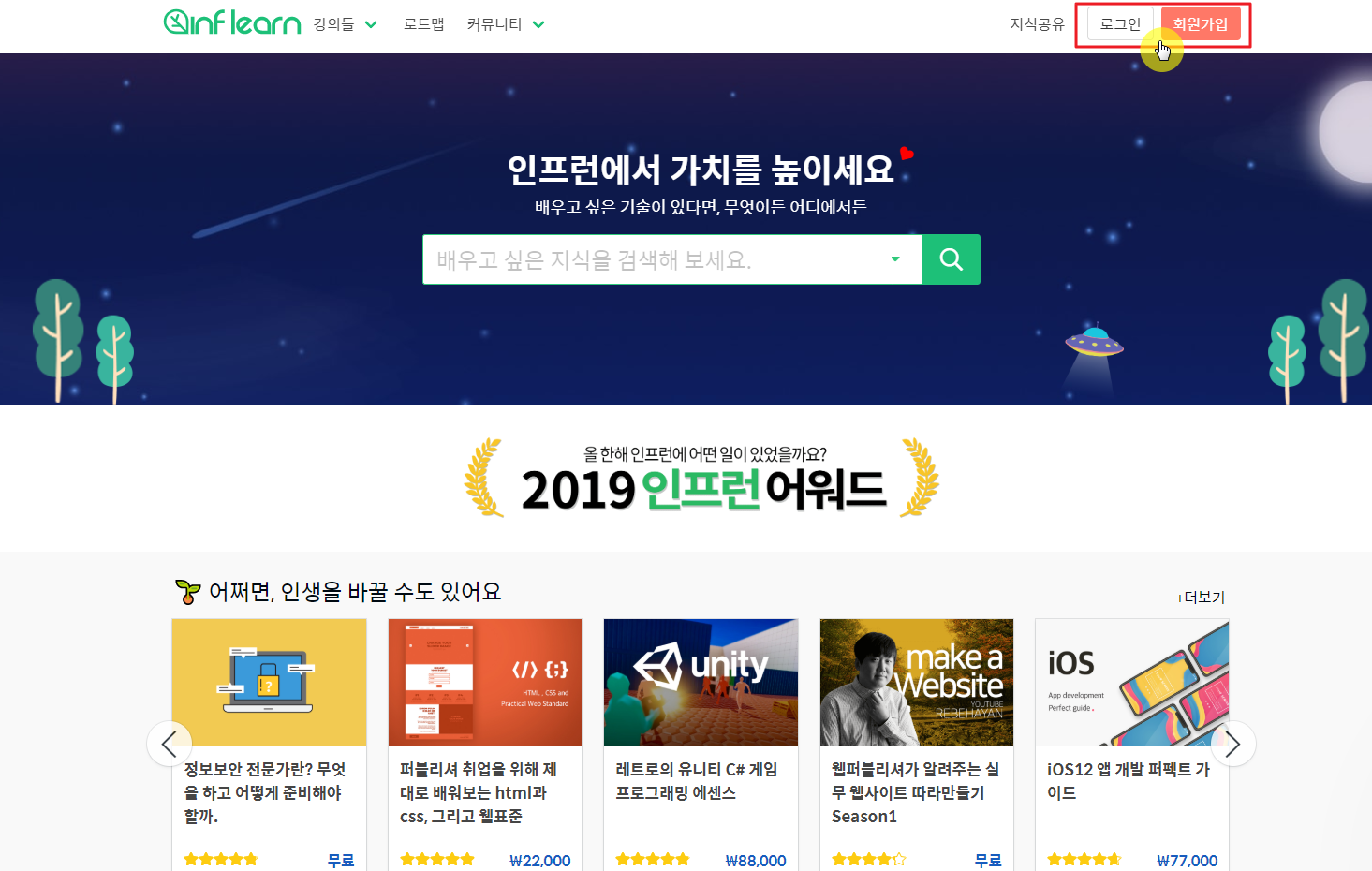 인프런 사이트를 접속하면 이런 화면을 접할 수 있습니다.