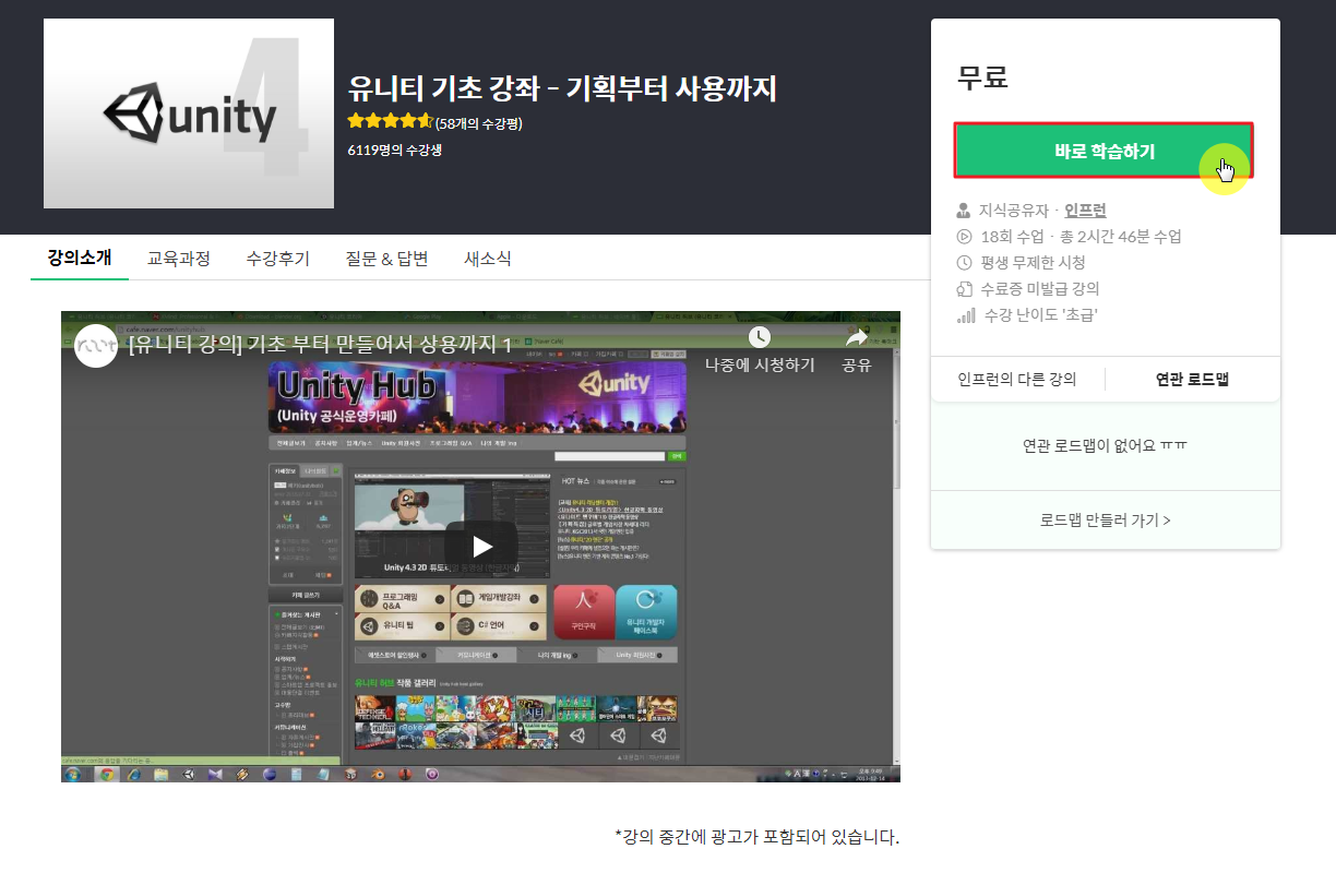 그럼 상단과 같이 미리보기 동영상 화면과 강의에 대한 교육 과정에 대한 설명이 있습니다.
