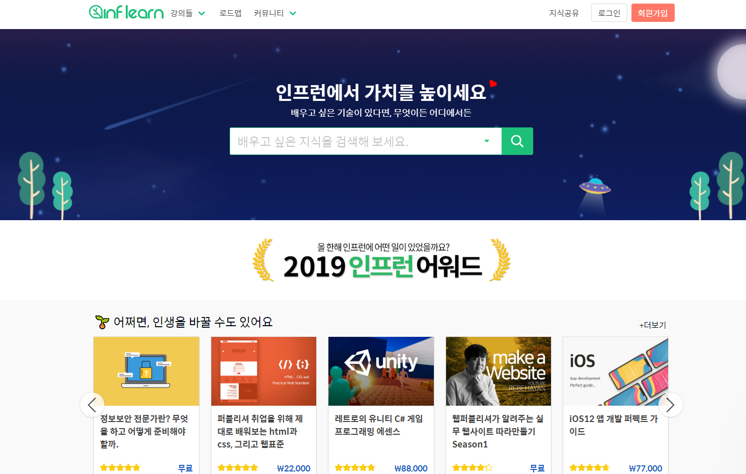 많은 무료 강의 사이트가 있지만 강의의 종류도 많고 수준이 높은 강의 사이트는 인프런인 것 같습니다.