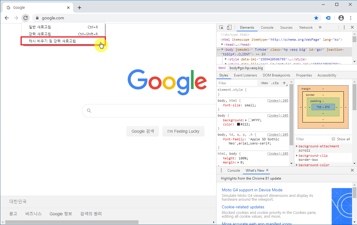 상단과 같이 강력 새로고침 메뉴 및 캐시 비우기 메뉴들이 호출됩니다.