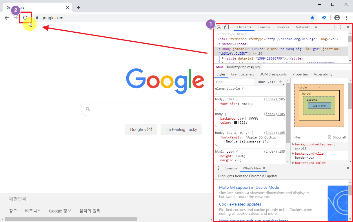 상단과 같이 개발자도구가 열려있는 상태에서 좌측 상단의 새로고침 아이콘에
