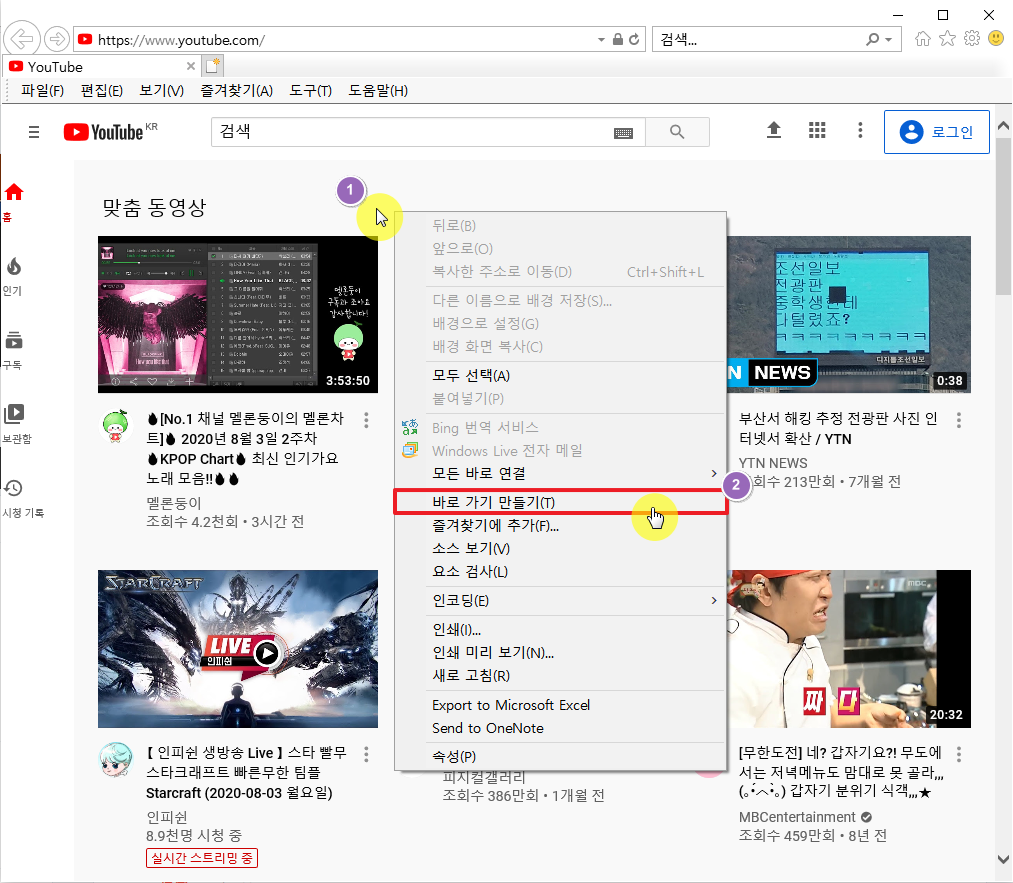 인터넷 익스플로러 유튜브 바로가기 생성 방법