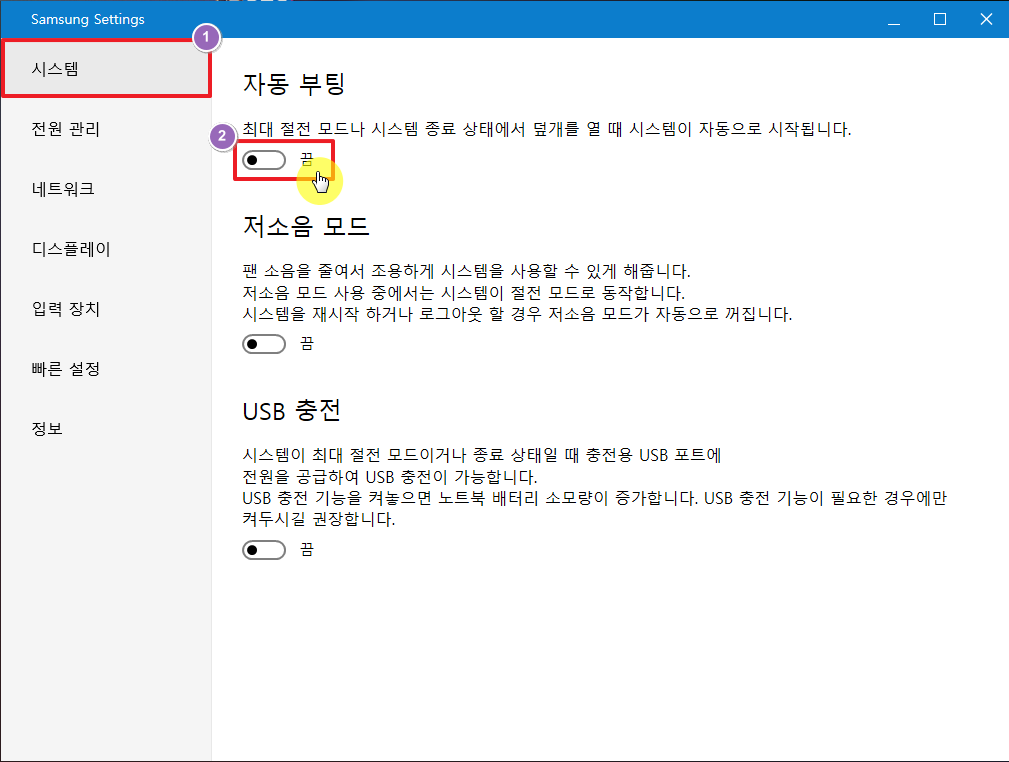 시스템 메뉴에 자동 부팅에 대한 설정이 존재합니다.